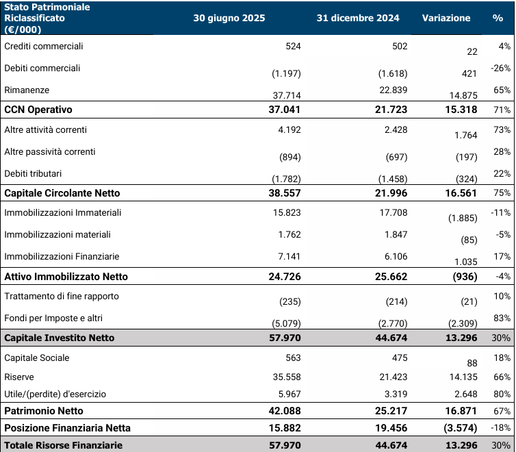 Stato Patrimoniale consolidato riclassificato al 30 giugno 2025 vs 31 dicembre 2024