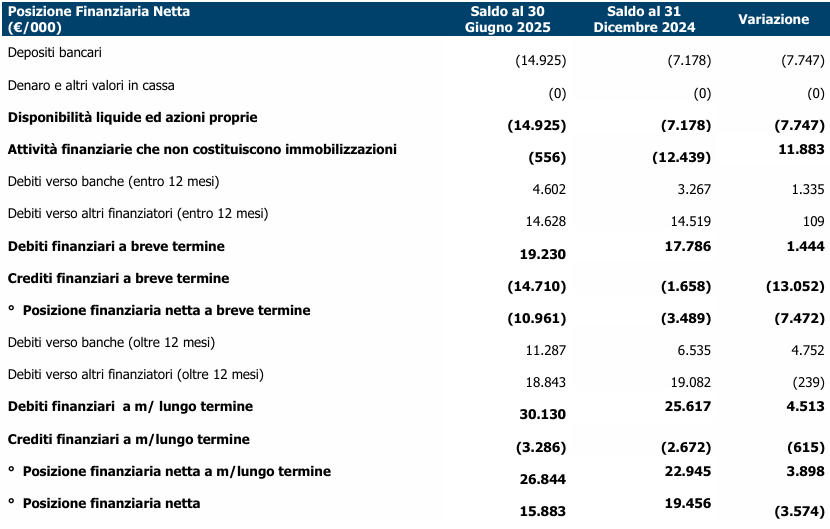 La Posizione Finanziaria Netta è pari a Euro 15,9 milioni, con un incremento di cassa di circa Euro 3,6