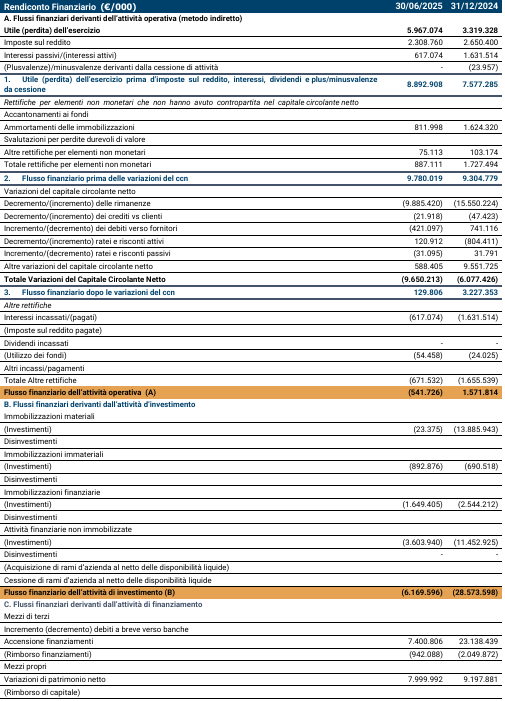 Rendiconto finanziario consolidato al 30 giugno 2025 vs 31 dicembre 2024