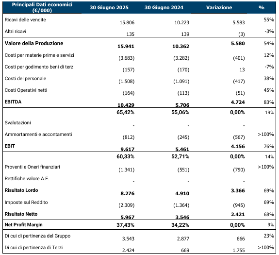 Il Valore della Produzione è pari a Euro 15,9 milioni, registra una crescita del 54% rispetto al 30 giugno